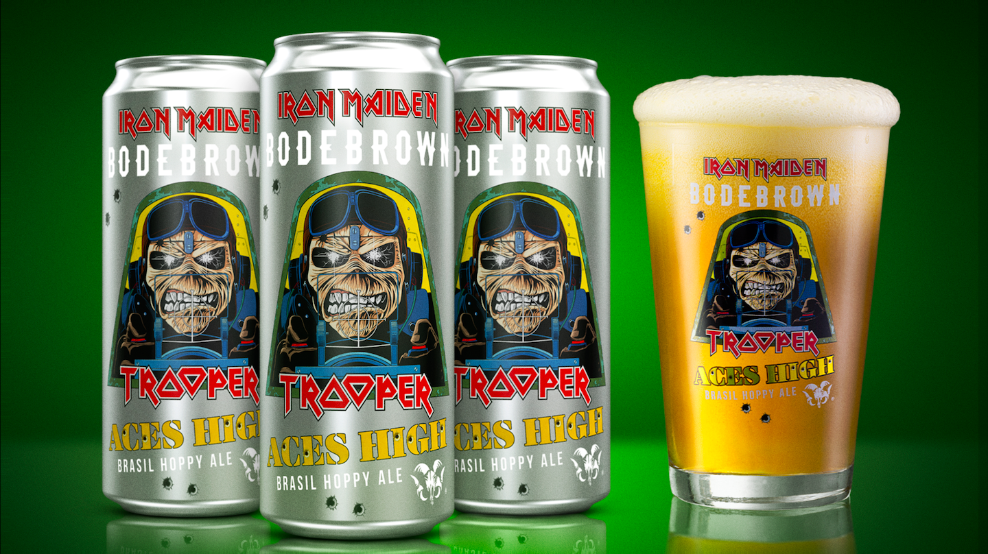 Se as Brut IPAs conversam com o universo dos espumantes, a outra estrela da noite fala com o heavy metal 🤘. A Aces High, cerveja inspirada na clássica música do Iron Maiden, ganhou um novo formato: além das garrafas de 750 ml, passa a ser vendida em latas de 473 ml, ao preço de R$ 19,50.